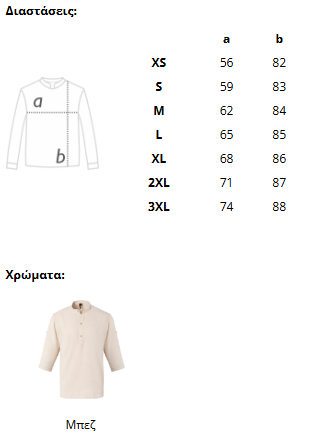 UNISEX πουκαμίσα με3/4 μανίκι, γιακά τύπου ΜΑΟ, πατιλέτα, 3κουμπιά μπροστά, ωμίτη, αναδιπλούμενα μανίκια, κουφωτή πιέτα στην πλάτη, σκίσιμο στα πλαϊνά.